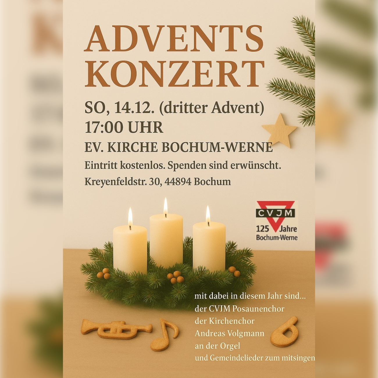 Herzliche Einladung zu einem musikalisch bunten Abend. Am 14.12.25 findet um 17 Uhr das Adventskonzert in unserer Kirche statt. Es musizieren der CVJM - Posaunenchor, der Kirchenchor und Andreas Volgmann an der Orgel. Außerdem werden gemeinsam Adventslieder gesungen. Vorbeikommen lohnt sich!